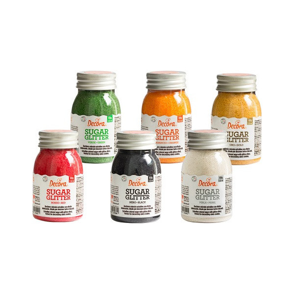 Zucchero glitterato rosso Decora da 100 g: cristalli di zucchero extra-fine color rosso, effetto glitterato, vivace, lucido e brillante. Zucchero decorativo, pronto all'uso, ideale per decorare torte, dolci biscotti e cupcakes.