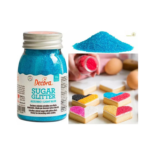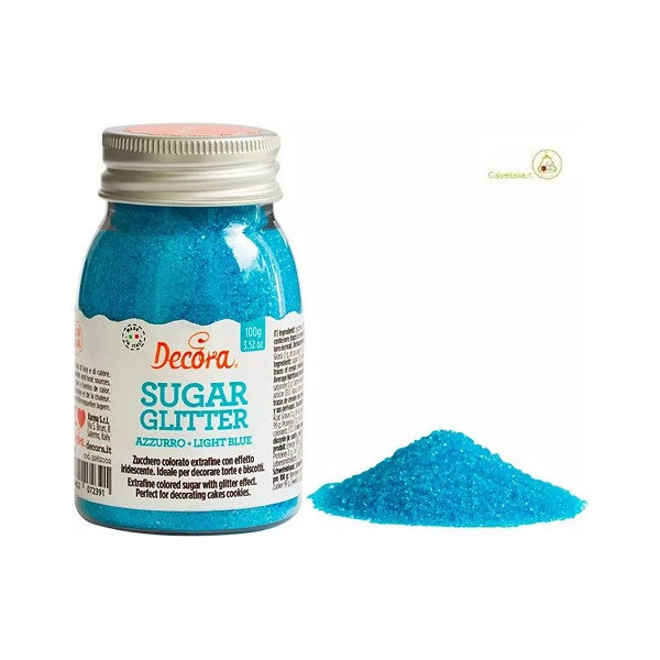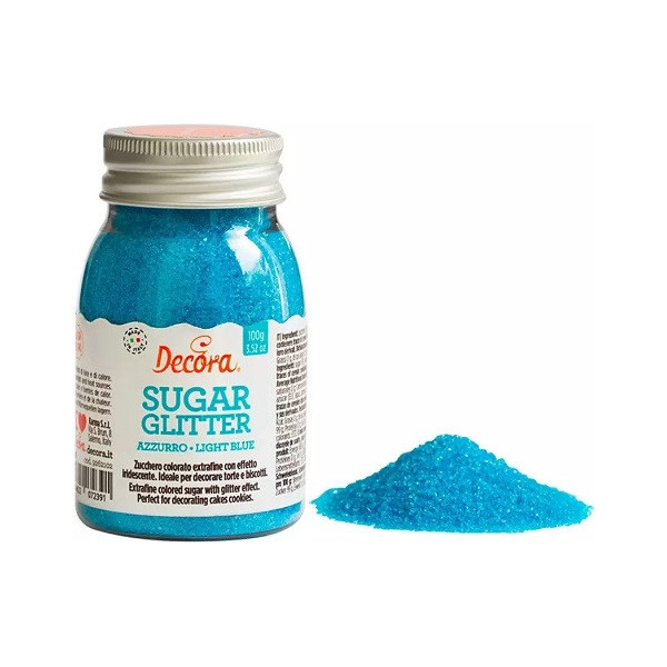 Zucchero glitterato azzurro Decora da 100 g: cristalli di zucchero extra-fine color azzurro, effetto glitterato, vivace, lucido e brillante. Zucchero decorativo, pronto all'uso, ideale per decorare torte, dolci biscotti e cupcakes.