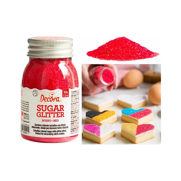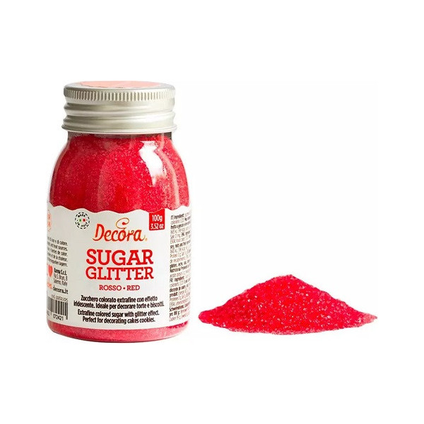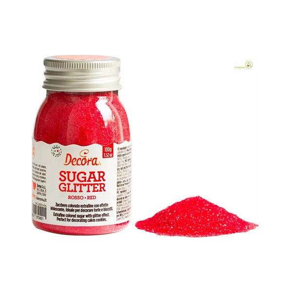 Zucchero glitterato rosso Decora da 100 g: cristalli di zucchero extra-fine color rosso, effetto glitterato, vivace, lucido e brillante. Zucchero decorativo, pronto all'uso, ideale per decorare torte, dolci biscotti e cupcakes.