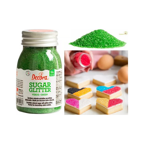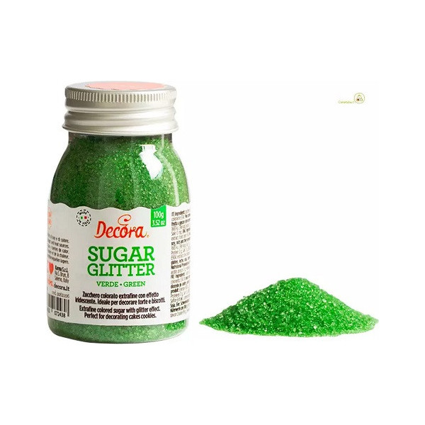 Zucchero glitterato verde Decora da 100 g: cristalli di zucchero extra-fine color verde, effetto glitterato, vivace, lucido e brillante. Zucchero decorativo, pronto all'uso, ideale per decorare torte, dolci biscotti e cupcakes.