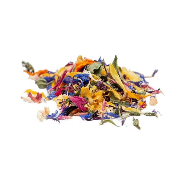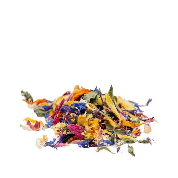 Materia prima: mix di petali di calendula, fiordaliso, malva, rosa, citronella, tagetes, menta rotundifolia, monarda