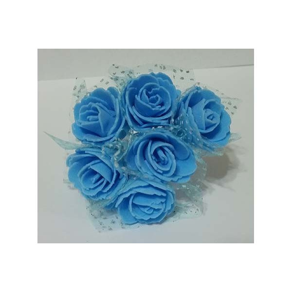 Rose in spugna con velo a pois celeste: bellissimo mazzettino di 6 rose in spugna e velo a pu̯à celeste, del diametro di 3 cm. Ideali per decorazioni e bomboniere, segnaposto e sacchettini