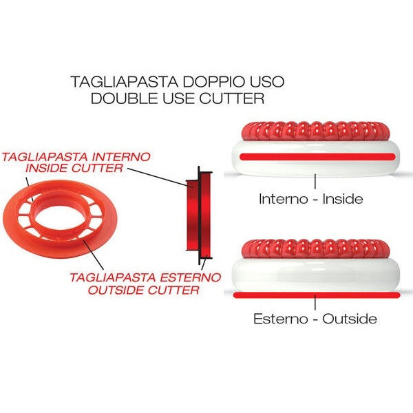 - Tagliapasta doppio uso --> Tagliapasta lato esterno per base d'appoggio e Tagliapasta interno per inserto in pandispagna o croccante.