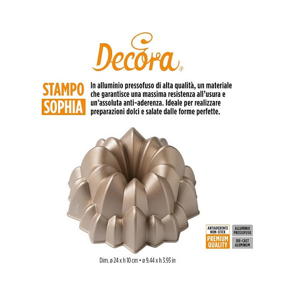 Sophia Decora, stampo per torte a ciambella in alluminio pressofuso antiaderente di alta qualità, color champagne, per uso intensivo e professionale di diametro 24 cm ed alto 10 cm.