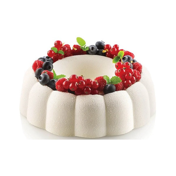 Lo stampo Paradise di Silikomart, è una ciambella tonda, in silicone bianco, con una cavità, da 22 cm x altezza 6 mm, per realizzare torta innovativa, sezionabile in 14 porzioni.