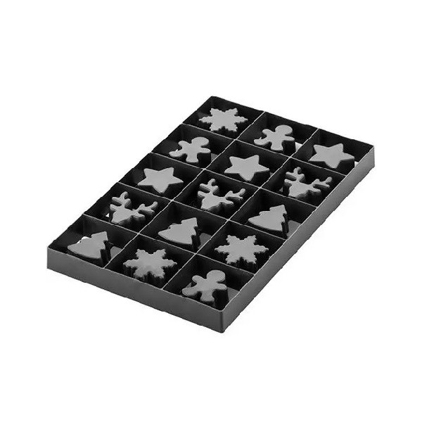 Forme cavità della placca o Cutter: 3 forme biscotti stella natalizia, 3 forme biscotti albero di natale, 3 forme biscotti omino gingerbread, 3 forme biscotti renna natalizia e 3 forme biscotti fiocco di neve,