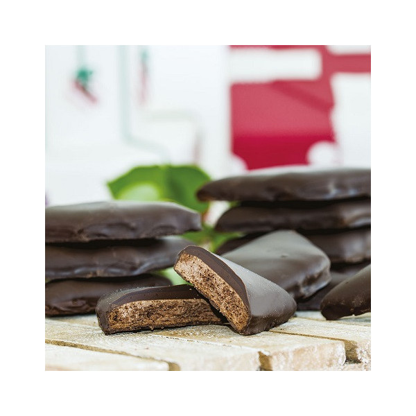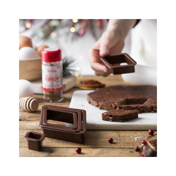 Set CiocCookies di Natale per galletta al cioccolato: tagliapasta in plastica per la base rettangolare a biscotto e stampo termoformato per placchette di cioccolato con decori natalizi, da Decora.