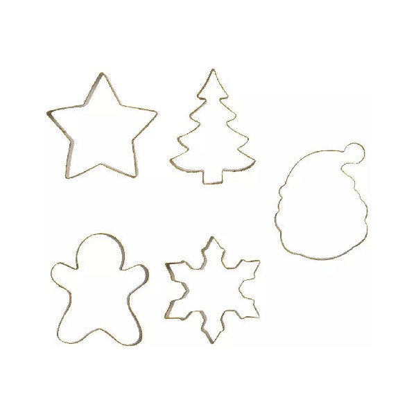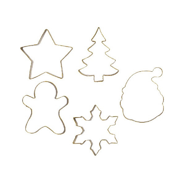 Set 5 stampi in metallo dorato ideali taglia-biscotti forme: babbo natale, albero di natale, Mr Ginger, fiocco di neve e stella natalizia, di dimensioni da 6 cm fino a 8 cm, altezza 2,2 cm da Decora.