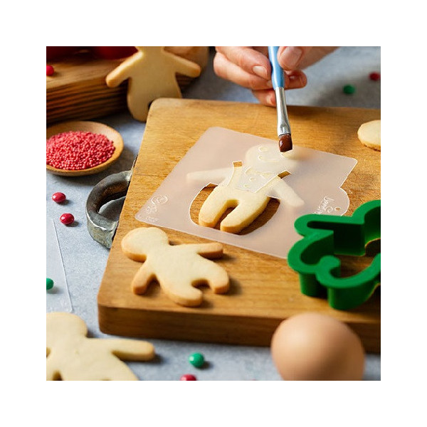 I 4 stencil, due per la forma grande e 2 per la forma piccola, usali per decori 3D che si adattano alle 2 sagome. Disegna visi, vestiti e teste, 3D, colorate con la ghiaccia reale, la crema al burro, lo zucchero a velo, il cacao, le polveri colorate, gli spray coloranti o l’aerografo.