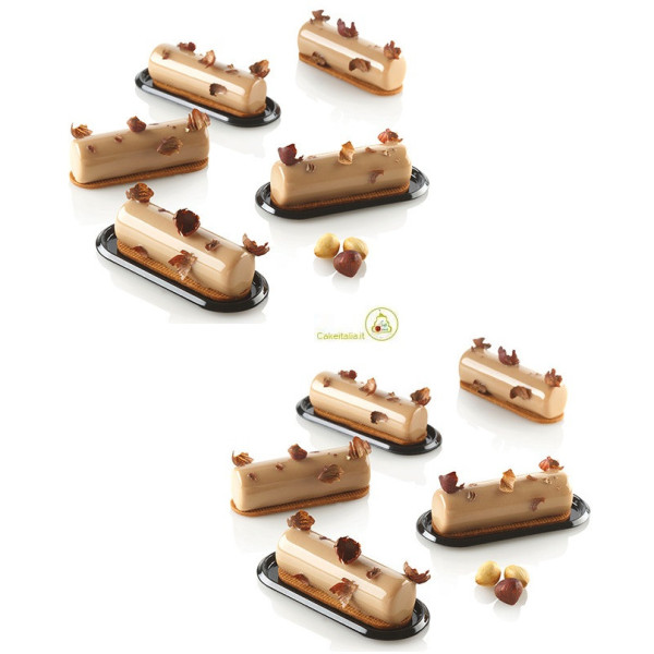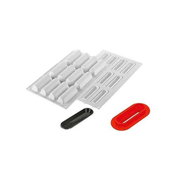 Kit Fingers 30 o 75 ml Silikomart: 1 stampo in silicone (top white, 3D) per cilindri arrotondati alle estremità + 1 cutter o tagliapasta per basi ed inserti + vassoi per presentazione.