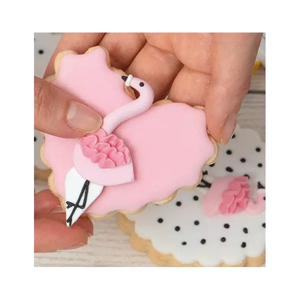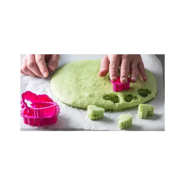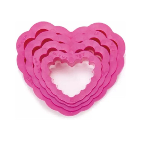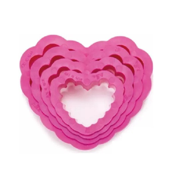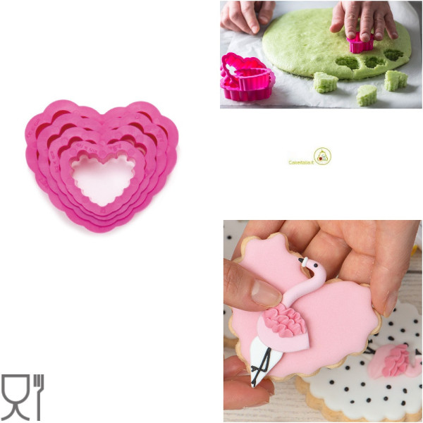 Stampini in plastica per creare formine di pasta di zucchero o biscotti a forma di cuori festonati.