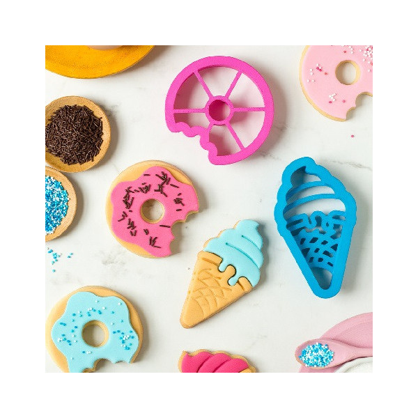 Stampini in plastica, tagliapasta o taglia-biscotti, per creare con paste modellabili, pasta di zucchero, cioccolato dei dolci a forma di ciambella con morso e cono gelato, 2 forme a tema estivo.