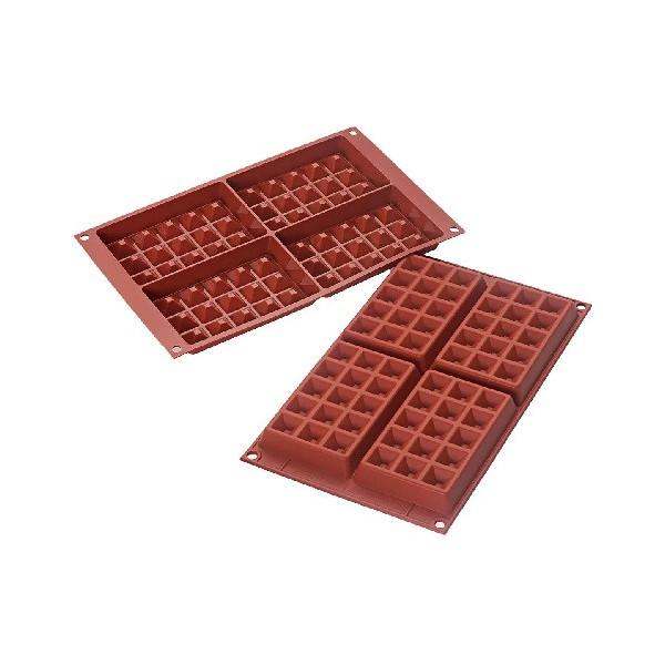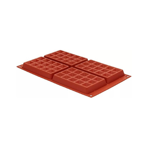 Stampo Waffel Silikomart flessibile e antiaderente realizzato in 100 % silicone liquido. Può essere messo direttamente dal forno al frigorifero e viceversa. Lavabile in lavastoviglie. Lo Stampo Waffel permette di realizzare 4 deliziosi Waffel in cioccolato o in preparazioni da forno da decorare poi con cioccolato, pasta di zucchero e Royal Icing.