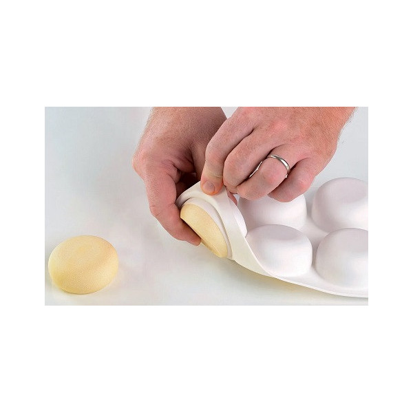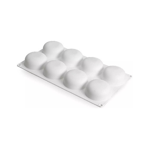Stone 85 è uno Stampo in Silicone, per semifreddi e preparazioni forno per 8 dolci di diametro 6,5 cm a forma sfera schiacciata, della linea Top White ad effetto 3D di Silikomart