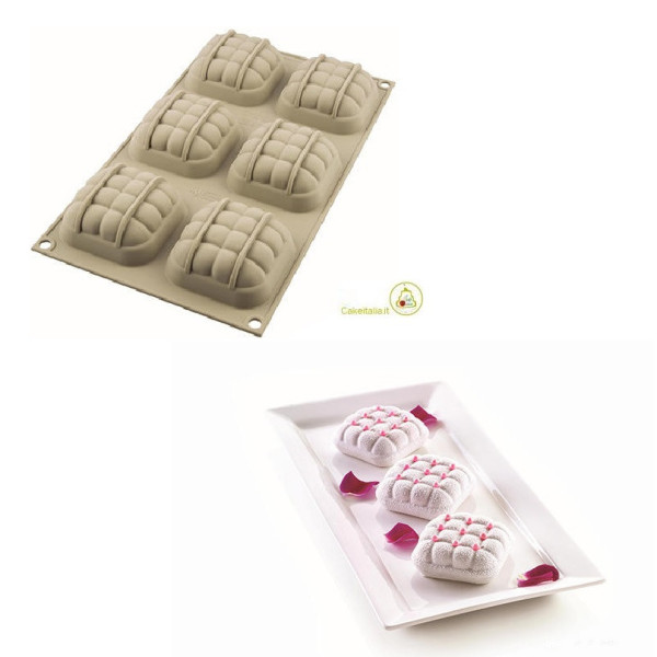 Stampo Mini Eleganza in silicone grigio da Silikomart per monoporzioni o tortine a forma di cuscino quadrato con decoro superficiale trapunta ad effetto tridimensionale di lato 7 cm ed altezza 3 cm