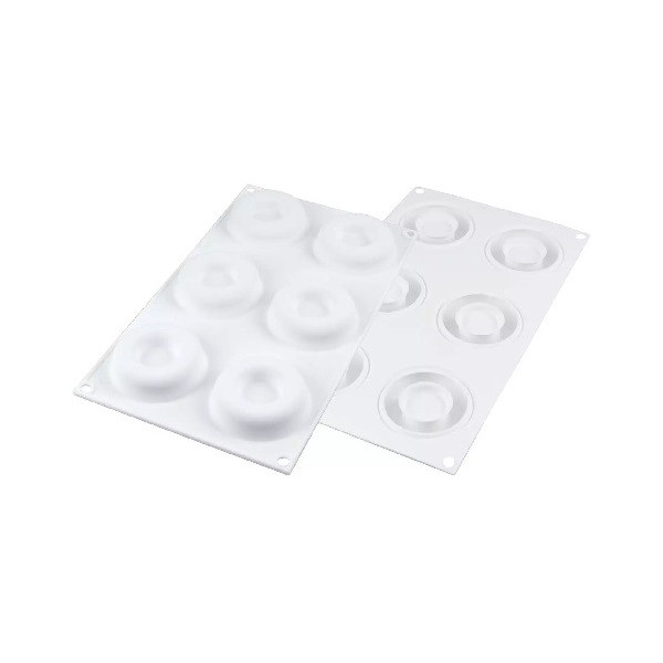 Stampo Paradis 37 o Kit Tarte Ring Paradis 80 Silikomart: stampo in silicone bianco Top White con 6 cavità tonde con decoro bolle o in kit con 6 anelli di 8 cm.