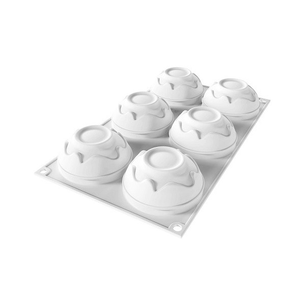 Splash 110 Silikomart: stampo in silicone bianco e un separatore in ABS, da Silikomart, per 6 tortine a forma di semisfera con effetto tridimensionale dal diametro di 7,1 cm ed altezza 3,65 cm