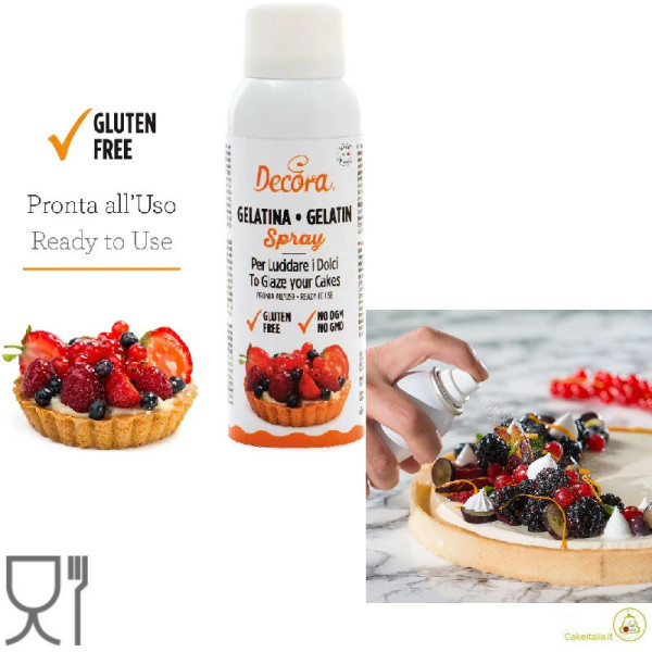 Gelatina spray pronta all'uso in bomboletta da 125 ml per decorazioni lucide e brillanti da Decora. Ideale per crostate di frutta macedonie e cialde di ostia.