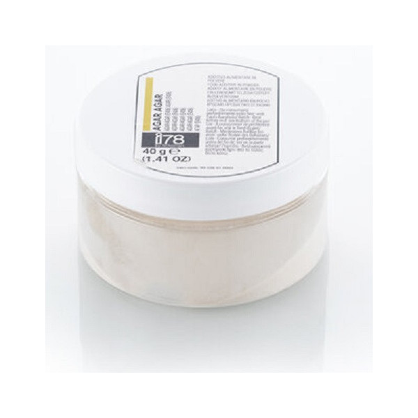 Agar Agar in polvere, stabilizzante, addensante, gelificante di origine vegetale per alimenti, ottenuto dalla lavorazione delle alghe rosse, in barattolo da 40 g da i78 di Silikomart.
