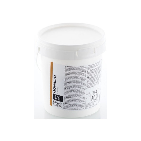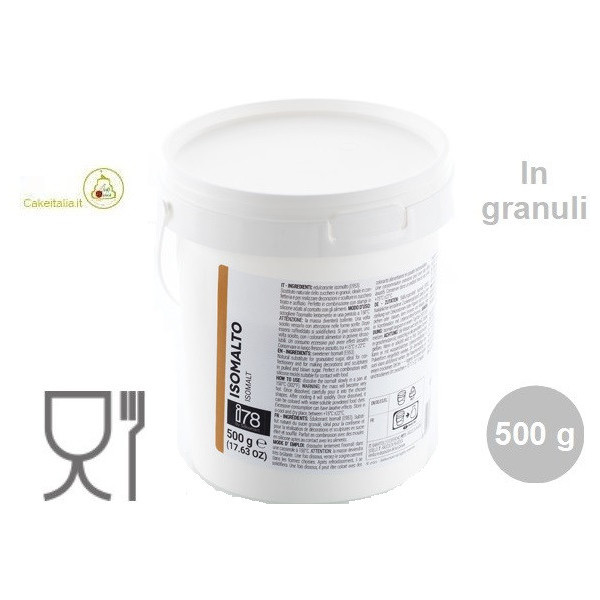 Isomalto bianco in granuli in barattolo da 500 g della linea i78 di Silikomart. Sostituto dello zucchero tradizionale ideale per decorare con costruzioni ad effetto vetro.