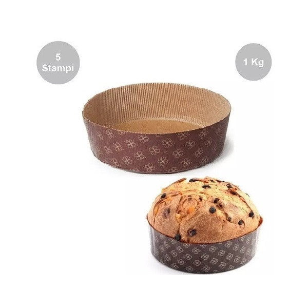Caratteristiche set 5 stampi panettoni bassi in carta cellulosa calandrata, usa e getta o monouso, da 1 Kg: