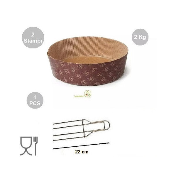 Il kit spillone 4 punte lungo 22 cm in acciaio inox da Decora, con 2 stampi panettoni bassi in carta cellulosa calandrata, usa e getta o monouso, da 2 Kg è composto da: