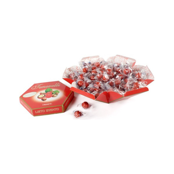 Tenerelli Lieto Evento Rossi Laurea Crispo 500 g: le migliori nocciole tostate ricoperte di cioccolato al latte e confettate rosso. Confetti rossi tondi confezionati singolarmente in astuccio lieto evento laurea Crispo.