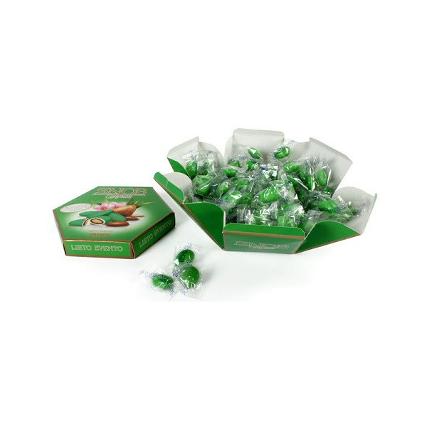 Confetti Verde Promessa alla nocciola, con un ripieno di finissimo cioccolato al latte, confezionati e incartati singolarmente, in astuccio vassoio Verde Promessa.
