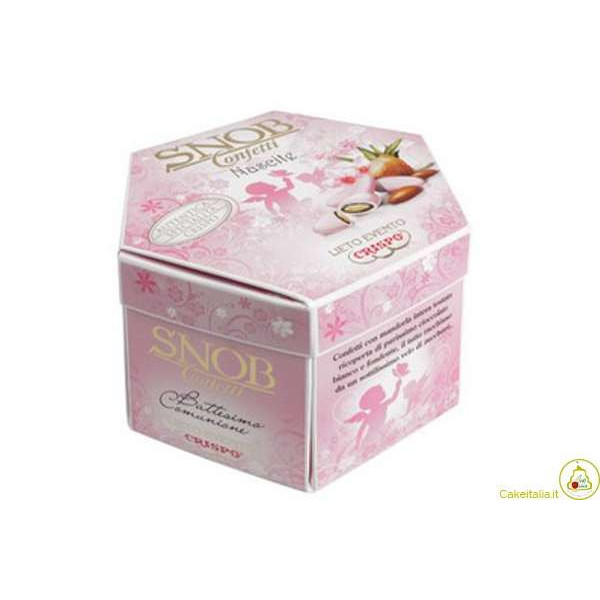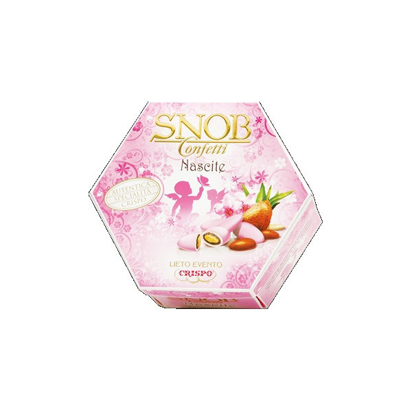 Snob Lieto Evento Nascita Bambina Crispo 500 g: confetti rosa, incartati singolarmente, con mandorla intera tostata ricoperta di purissimo cioccolato bianco. Ideali per celebrare la propria bambina.