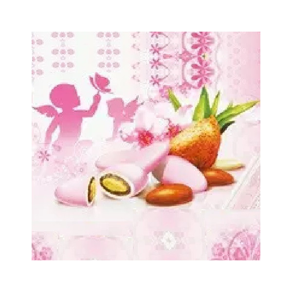 Confetti rosa alla mandorla, con un ripieno di cocco, limone, fragola, arancia, cappuccino, ricotta e pera, zuppa inglese e cioccolato al latte, incartati e confezionati singolarmente, in astuccio vassoio rosa.
