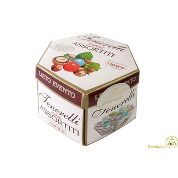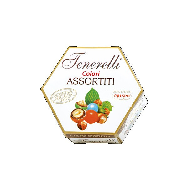 Lieto Evento Tenerelli Colori Assortiti: 500 g confetti colori assortiti alla nocciola Crispo, confezionati in vassoio ed incartati singolarmente ideali per cerimonia