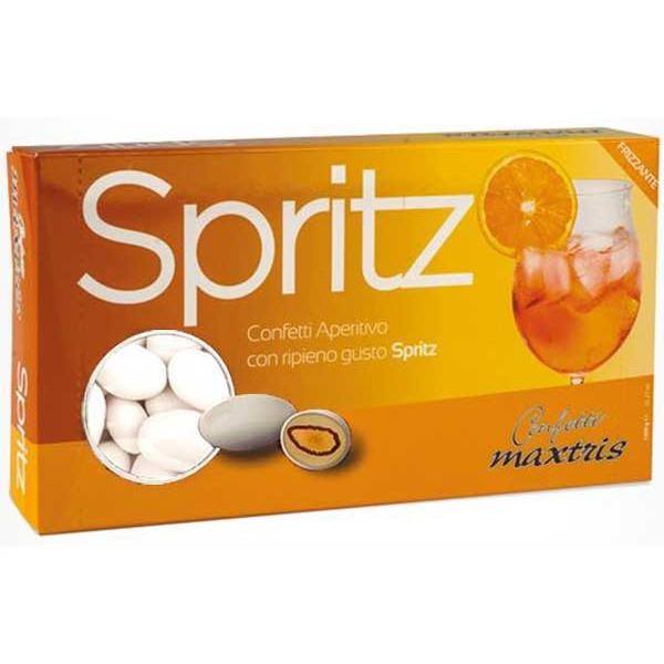 Maxtris Spritz confetti bianchi 1 Kg: mandorla tostata ricoperta da cioccolato bianco al gusto spritz e da un sottile strato di zucchero, ideali per confettata.