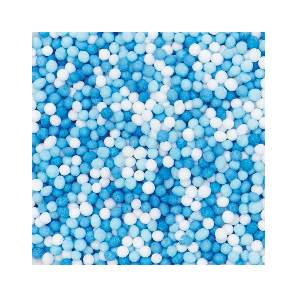 Perline di zucchero bianco, celeste e blu, da cospargere direttamente su torte, cupcakes e biscotti e vivacizzare le tue creazioni, realizzati con coloranti estrazione naturale.