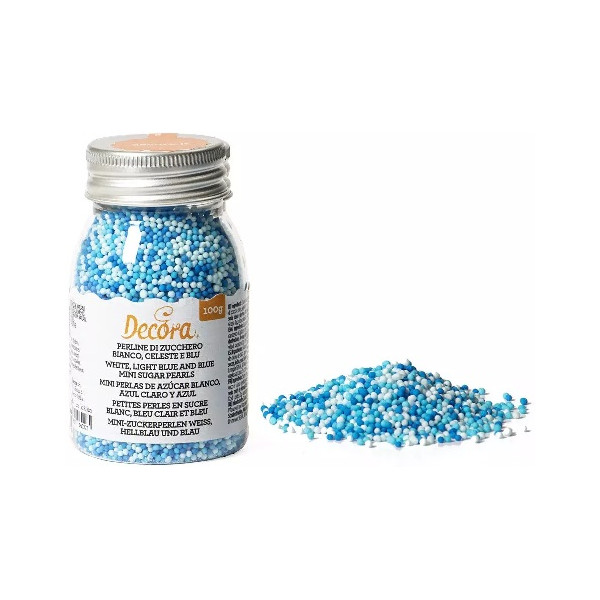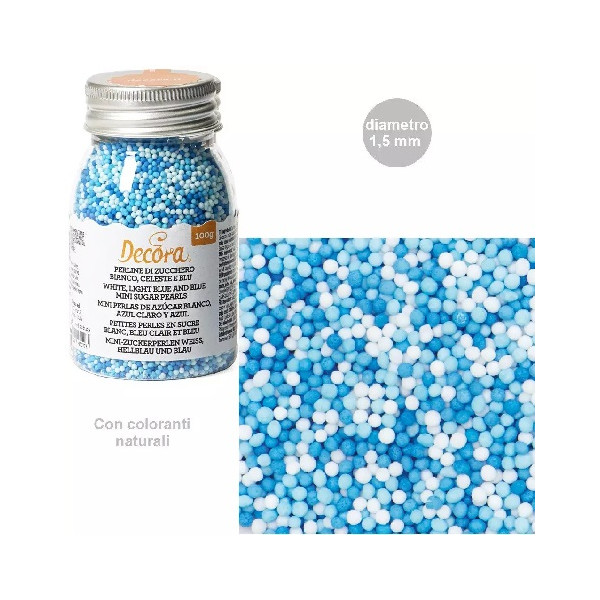 Perline di zucchero bianco, celeste e blu, da 100 g e diametro 1,5 mm, di colori bianco, celeste e blu, linea Decorsugar Decora.