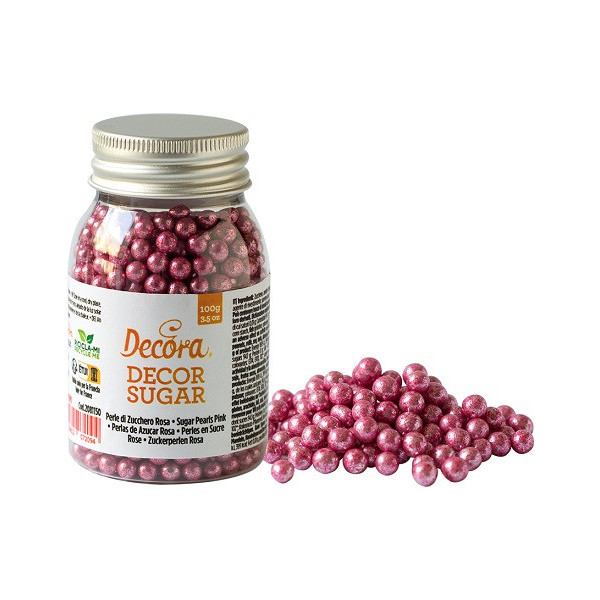 Perle di zucchero rosa metallizzate, da 100 g e diametro 5 mm, linea Decorsugar Metallizzato da Decora.