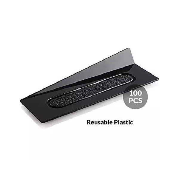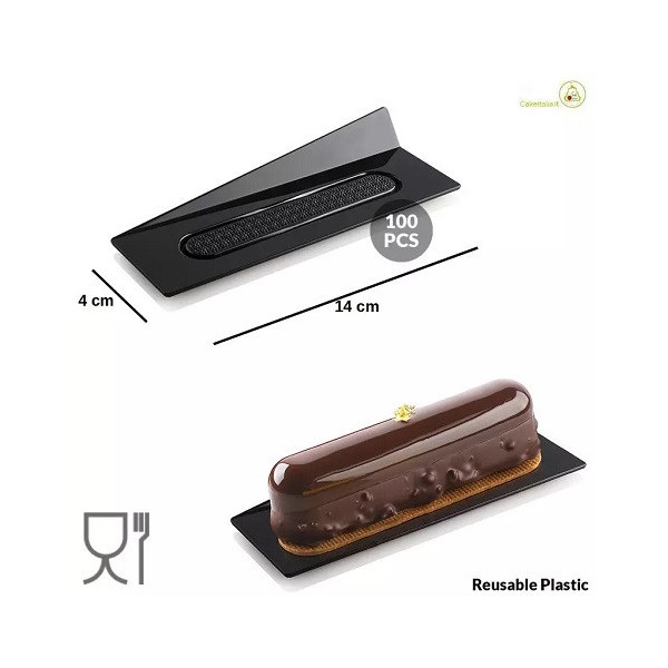 100 Vassoi monoporzioni rettangolari in plastica neri riutilizzabile ed antigraffio, con area antiscivolo lunghi 14 cm, larghi 4 cm, da Silikomart. Vassoietti ideali per esporre, trasportare e prelevare dolci monoporzioni.