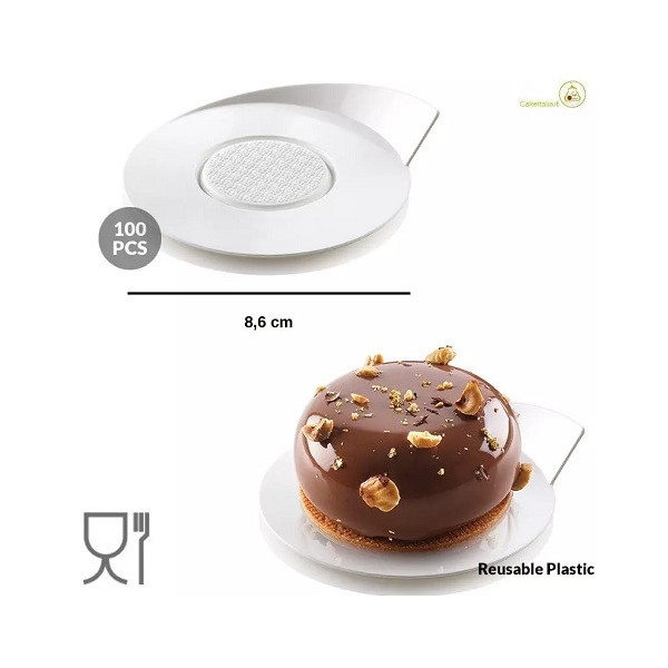 Set di 100 vassoi rotondi per monoporzioni in plastica bianca riutilizzabile ed antigraffio, con area antiscivolo dal diametro 86 mm, da Silikomart. Vassoietti ideali per esporre, trasportare e prelevare dolci monoporzioni.
