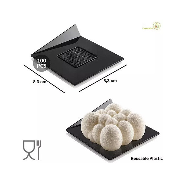 100 Vassoi monoporzioni quadrati in plastica nera riutilizzabile ed antigraffio, con area antiscivolo dal lato 83 mm, da Silikomart. Vassoietti ideali per esporre, trasportare e prelevare dolci monoporzioni.