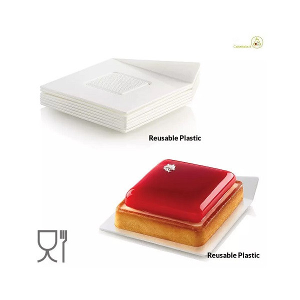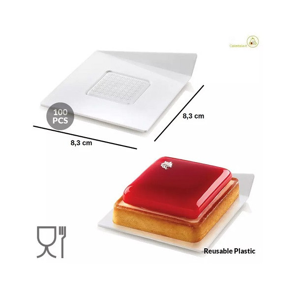 100 Vassoi monoporzioni quadrati in plastica bianca riutilizzabile ed antigraffio, con area antiscivolo dal lato 83 mm, da Silikomart. Vassoietti ideali per esporre, trasportare e prelevare dolci monoporzioni.