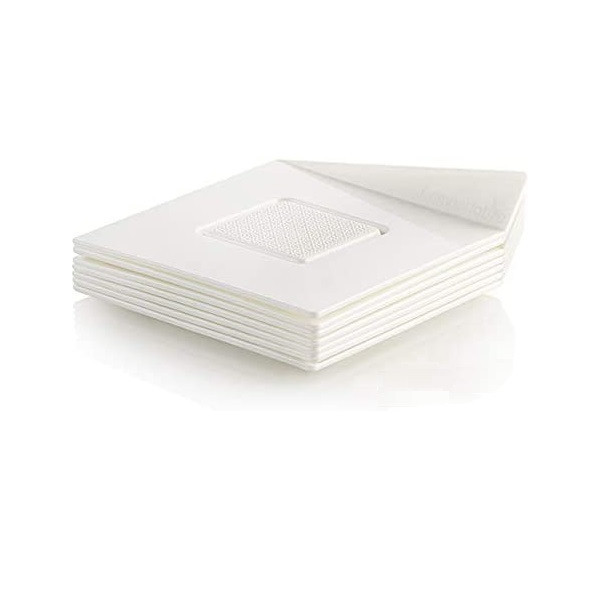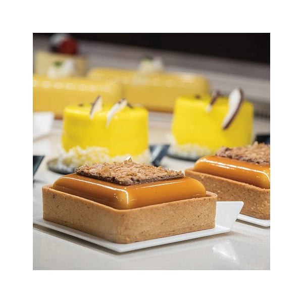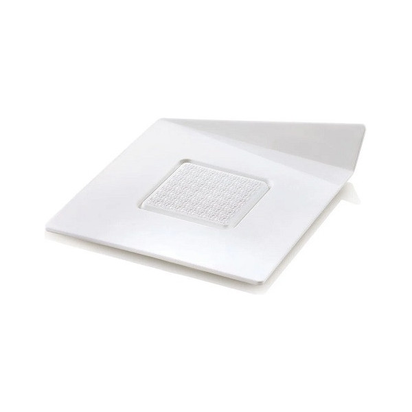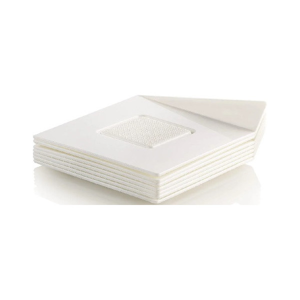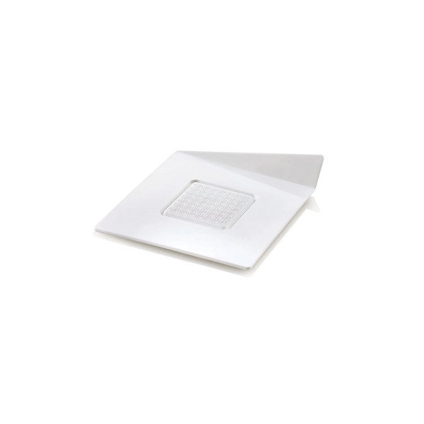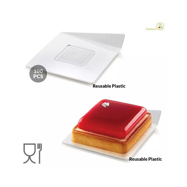 100 Vassoi monoporzioni quadrati in plastica bianca riutilizzabile ed antigraffio, con area antiscivolo dal lato 83 mm, da Silikomart. Vassoietti ideali per esporre, trasportare e prelevare dolci monoporzioni.