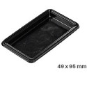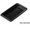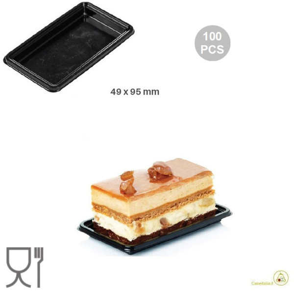 100 piattini monoporzioni rettangolari plastica rigida nera riutilizzabile, con bordino di lato: 49 x 95 mm o 80 x 50 mm, di Silikomart. Vassoietti ideali per esporre, trasportare e prelevare dolci.
