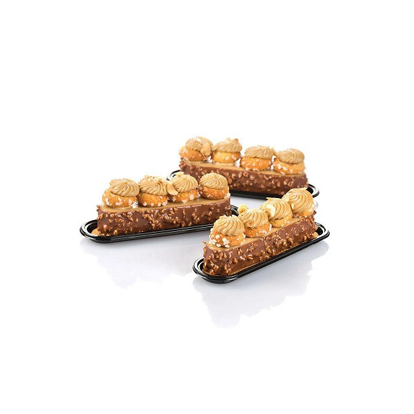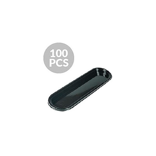 Set 100 Piattini Monoporzioni Fashion Eclair Silikomart: in plastica rigida nera riutilizzabile, con bordino di lato, ideali per esporre, trasportare e prelevare dolci.