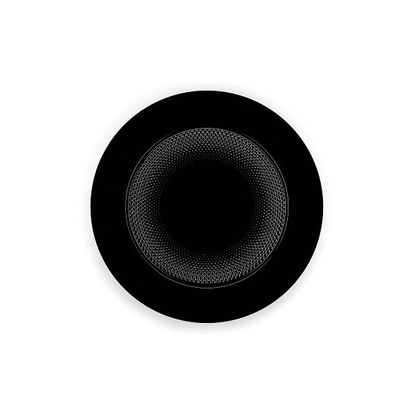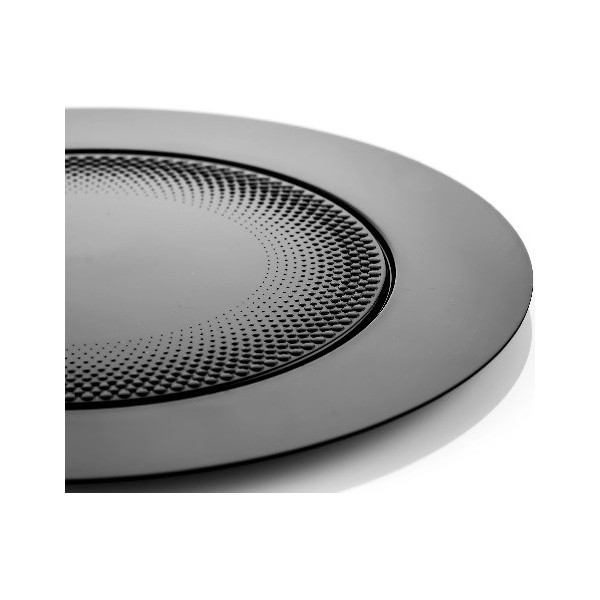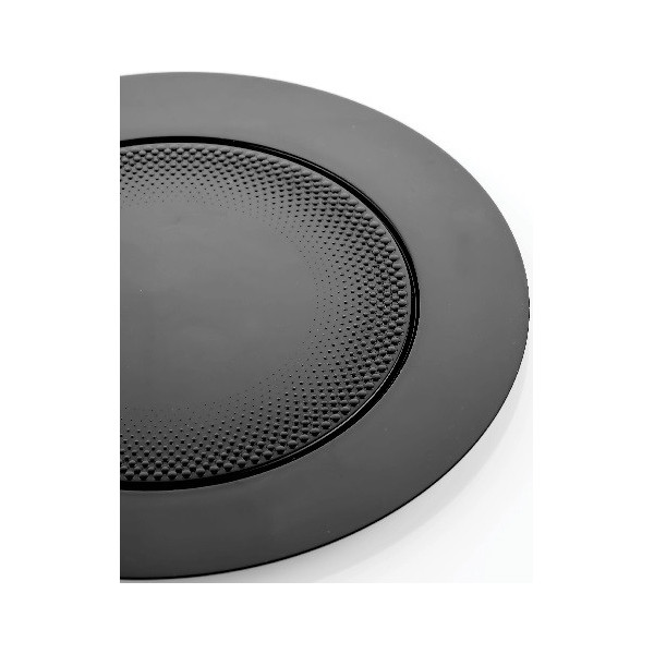 Set 100 piattini monoporzioni rotondi in plastica rigida nera riutilizzabile, con bordino di diametro 10 cm, di Silikomart. Vassoietti ideali per esporre, trasportare e prelevare dolci.