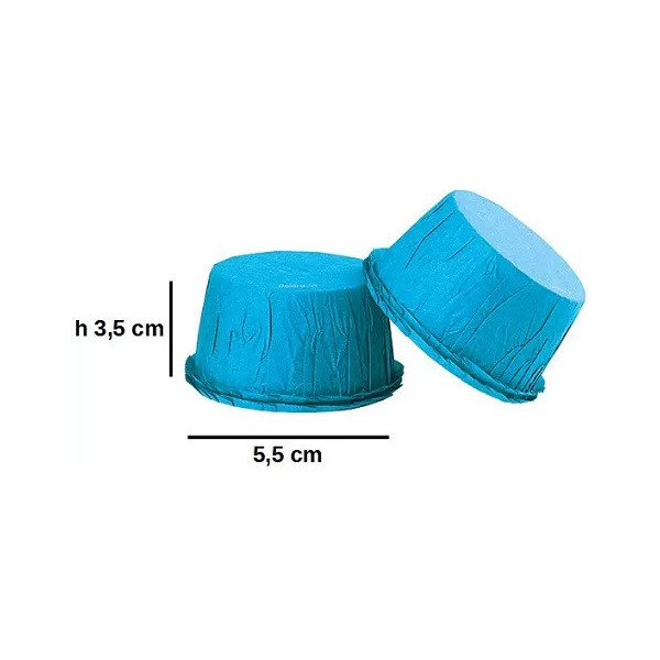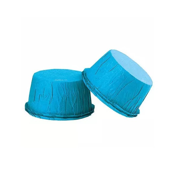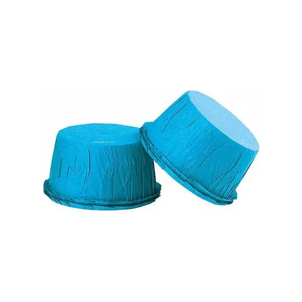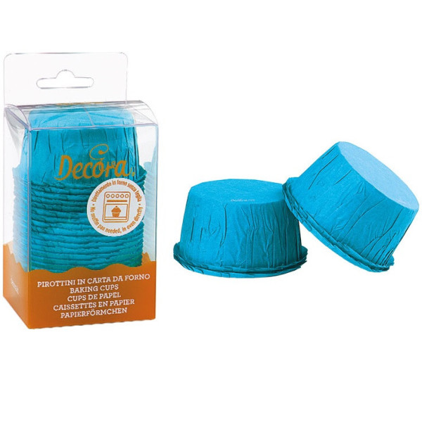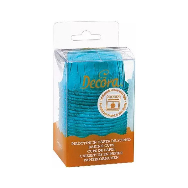 25 Pirottini in carta increspata celeste, antiaderente, resistente fino a 220 °C direttamente in forno, diametro 55 mm ed h 35 mm da Decora. Ideali per cuocere e presentare piccoli dolcetti.