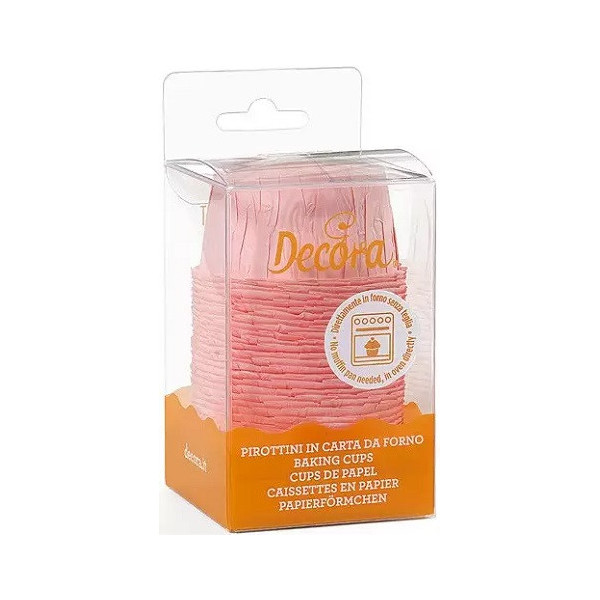25 Pirottini in carta increspata rosa, antiaderente, resistente fino a 220 °C direttamente in forno, diametro 55 mm ed h 35 mm da Decora. Ideali per cuocere e presentare piccoli dolcetti.