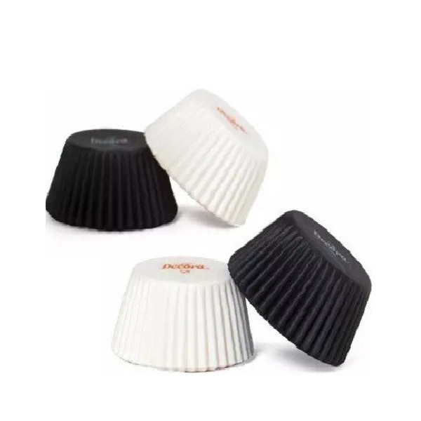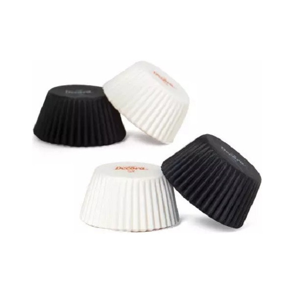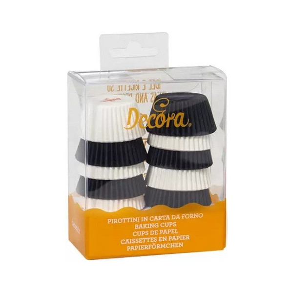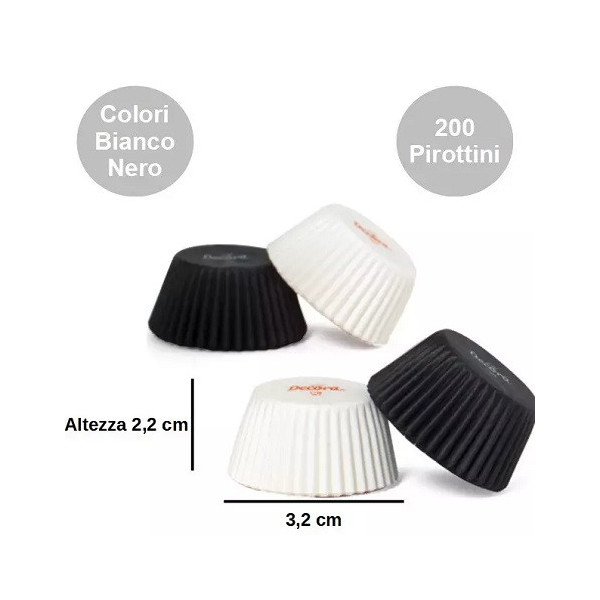 200 Pirottini Mini Muffin bianco nero in carta forno antiaderente, resistente fino a 220 °C, diametro 3,2 cm altezza 2,2 cm da Decora. Ideali per cuocere e presentare piccoli dolcetti.