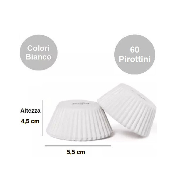Pirottini muffin bianchi in carta forno antiaderente, resistente fino a 220 °C, per: mini muffin ø3,2xh2,2 cm o muffin ø5xh3,2 cm o jumbo muffin ø5,5xh4,5 cm. Ideali per cuocere e presentare piccoli dolcetti.