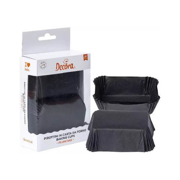 36 Pirottini neri per mini plum cake in carta forno antiaderente, resistente fino a 220 °C, lunghi 8 cm, larghi 5 cm, alti 3,2 cm da Decora. Ideali per cuocere e presentare mini plum-cake e dolcetti.