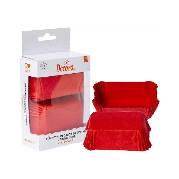36 Pirottini rossi per mini plum-cake in carta forno antiaderente, resistente fino a 220 °C, lunghi 8 cm, larghi 5 cm, alti 3,2 cm da Decora. Ideali per cuocere e presentare mini plum xake e dolcetti.