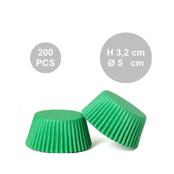 Confezione di 200 pirottini per muffin in carta forno verde, antiaderente, resistente fino a 220 °C, diametro 5 cm altezza 3,2 cm. Ideali per cuocere e presentare piccoli dolcetti.